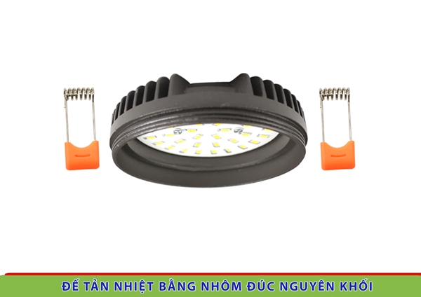 #Có 3 kiểu đế tản nhiệt phổ biến: ___ Đế tản nhiệt bằng nhựa: Loại này tản nhiệt không tốt làm đèn nhanh hỏng hoặc suy giảm chất lượng ánh sáng ___ Đế tản nhiệt bằng nhôm đúc xẻ rãnh tản nhiệt loại này tản nhiệt rất tốt nhưng nhược điểm làm đế đèn rất dày ___ Đế tản nhiệt bằng nhôm đúc nguyên khối: Loại này tản nhiệt tốt, đảm bảo độ dày của đèn không quá dày Đế tản nhiệt đèn downlight Kingled là loại nhôm đúc nguyên khối có nhiều gân tản nhiệt. Nhiệt độ trung bình của đèn chỉ dưới 45 độ .