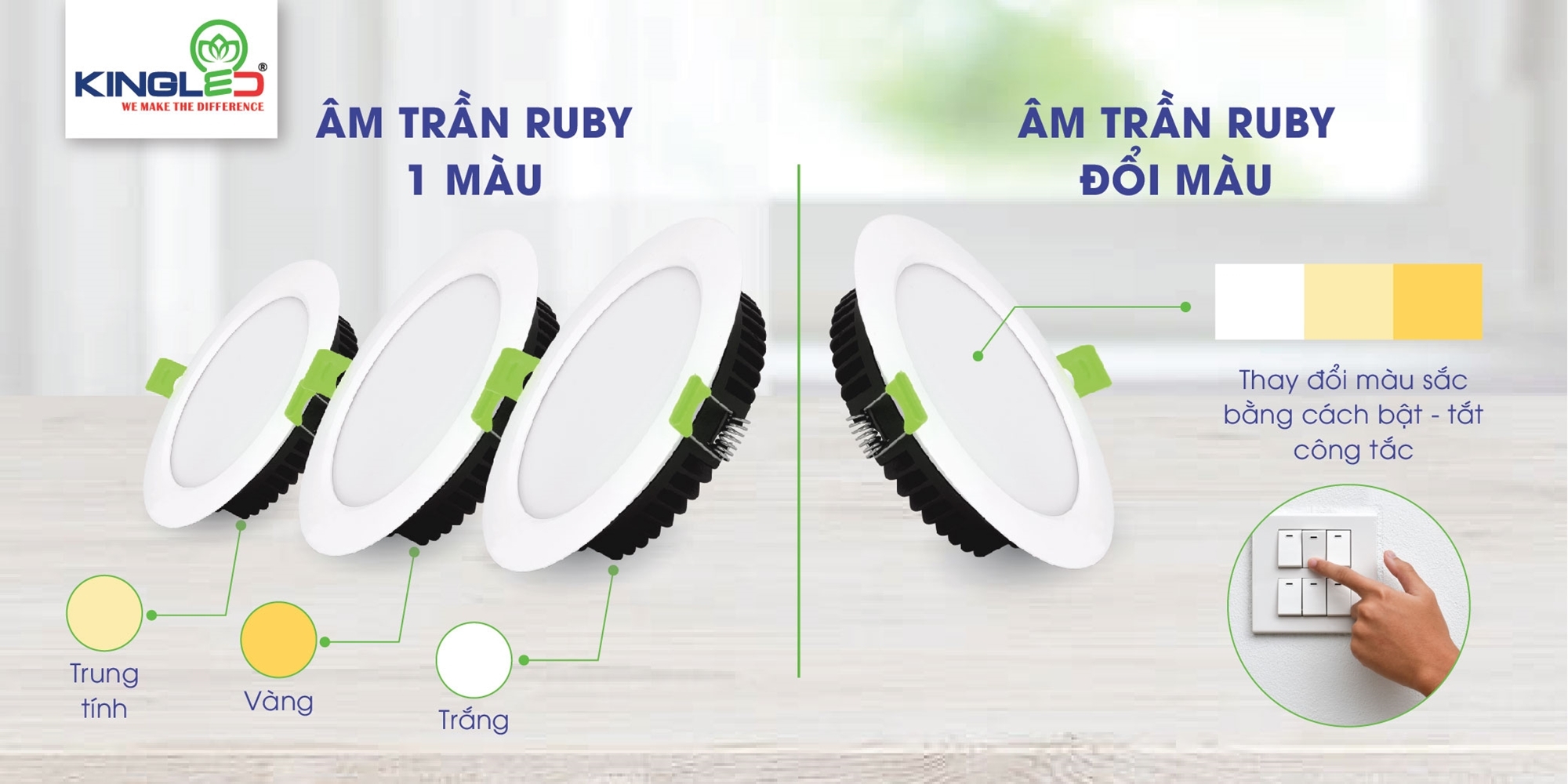 Đèn downlight âm trần Ruby được có 02 series là âm trần 1 màu ánh sáng (Trắng hoặc vàng hoặc Trung tính); âm trần đổi màu (thay đổi mầu qua việc bật công tắc) giúp phù hợp với hầu khắp các không gian thiết kế từ dân dụng tới công nghiệp.