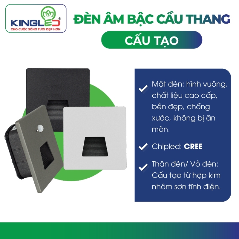 Đèn âm bậc cầu thang Kingled được cấu tạo từ hợp kim nhôm cao cấp sơn tĩnh điện. Đây là loại chất liệu bền bỉ, có khả năng chịu nhiệt - ẩm, chống xước - không bị ăn mòn.