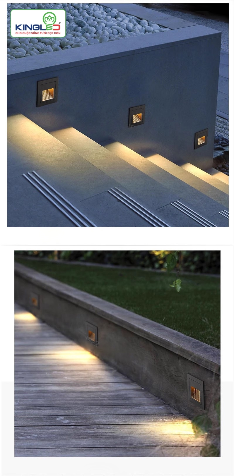 Đèn âm bậc cầu thang Kingled không cảm biến được ứng dụng trong chiếu sáng và trang trí khu vực cầu thang, hành lang, sân vườn, trong nhà,...Thiết kế góc chiếu sáng hình thang mới lạ, không gây chói mắt cho người đi lại.