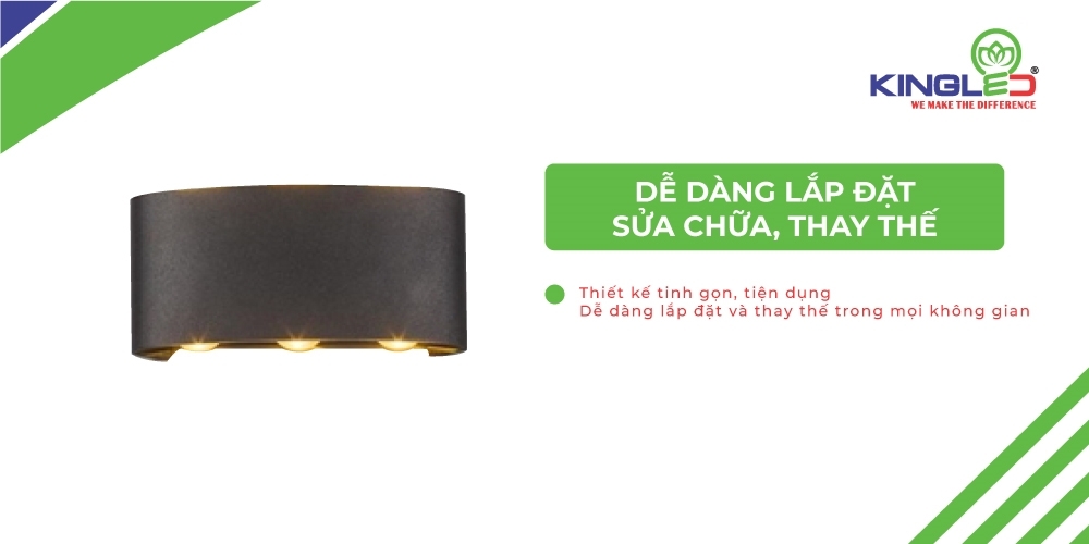 Đèn gắn tường với thiết kế tinh gọn, tiện dụng giúp dễ dàng lắp đặt và thay thế trong mọi không gian.