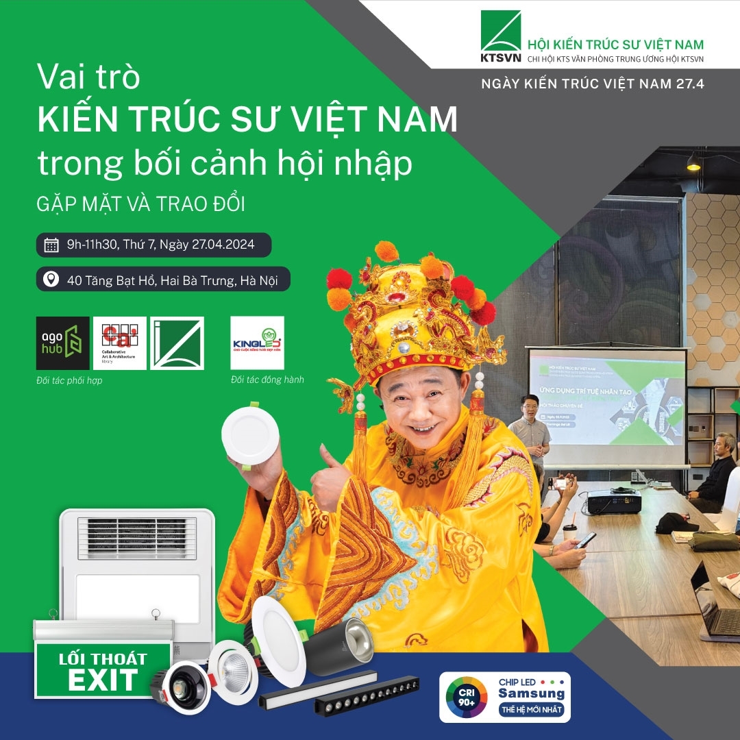 Kỷ niệm Ngày Kiến Trúc Việt Nam 27/4, Hội Kiến Trúc Sư Việt Nam, cùng với Chi Hội Kiến Trúc Sư Văn Phòng Trung Ương và CLB Kiến Trúc Sư Agohub cùng đơn vị đồng hành Đèn Led Kingled, đã tổ chức thành công buổi gặp gỡ và trao đổi về vai trò quan trọng của kiến trúc sư trong bối cảnh hội nhập. Đây không chỉ là dịp để chia sẻ kinh nghiệm và cập nhật thông tin, mà còn là cơ hội để mở rộng hiểu biết và đề xuất ý tưởng để phát triển ngành kiến trúc tại Việt Nam trong bối cảnh toàn cầu.