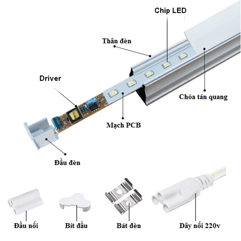 Cấu tạo của đèn tuýp led khá đơn giản với điểm nổi bật là việc sử dụng chip led để tạo ra nguồn sáng. Từ đó mang đến một thiết bị chiếu sáng có nhiều ưu điểm vượt trội, chất lượng cao và an toàn với người dùng.