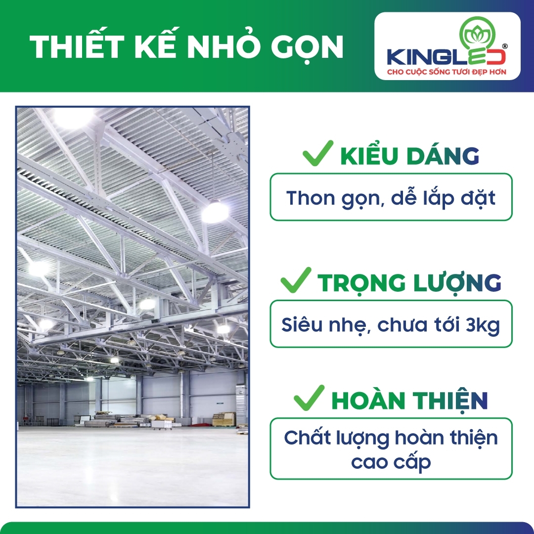 Trọng lượng siêu nhẹ này cho phép đèn Highbay Kingled có thể lắp đặt được ở bất kì vị trí nào, đặc biệt là trên cao.