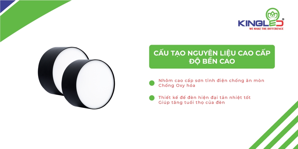Thân đèn và đế đèn đều được chế tạo từ hợp kim nhôm cao cấp và phủ một lớp sơn tĩnh điện chống ăn mòn, chống Oxy hóa. Thiết kế đế đèn hiện đại tản nhiệt tốt giúp tăng tuổi thọ của đèn.
