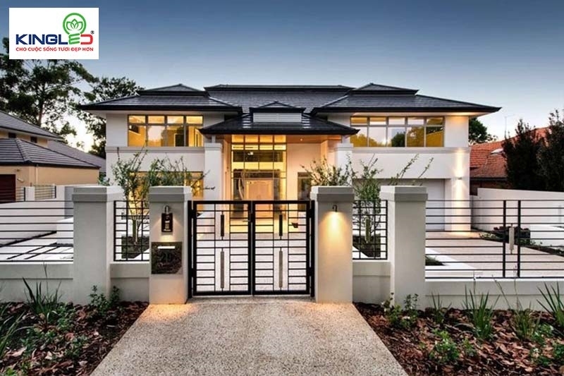 Sân, hiên nhà là nơi thường xuyên diễn ra các hoạt động ngoài trời của nhiều gia đình. Khu vực này có thể được thiết kế các loại đèn treo tường hoặc đèn trên trụ cột tầm cao là hoàn toàn hợp lý. Bạn có thể kế hợp nhiều loại đèn khác nhau để tạo nên những lớp ánh sáng đẹp mắt. Lưu ý lựa chọn màu sắc ánh sáng sao cho hài hòa với nhau và với kiến trúc của công trình.