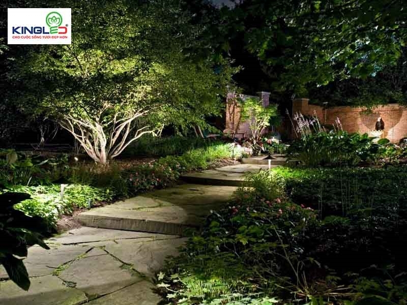 Lối đi sân vườn sẽ có nhiều sự lựa chọn về sản phẩm hơn như đèn led âm đất, đèn cắm cỏ, đèn trụ sân vườn, đèn pha led,... Lưu ý khi lắp đặt đèn cho lối đi là lựa chọn đèn có công suất vừa phải, khoảng cách giữa các đèn hợp lý để không tạo nên nguồn sáng quá lớn, gây chói mắt hoặc ánh sáng yếu, không đảm bảo an toàn.