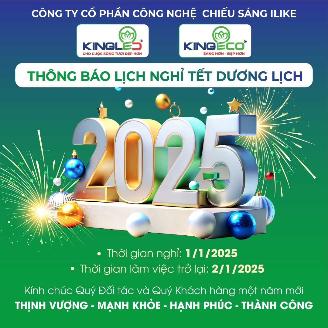 Với mục tiêu mang đến sự tiện lợi cho Quý khách trong việc sắp xếp kế hoạch làm việc và liên hệ, Công ty Cổ phần Công nghệ Chiếu sáng ILIKE với 2 thương hiệu ĐÈN LED KINGLED và KINGECO trân trọng thông báo lịch nghỉ Tết Dương Lịch 2025