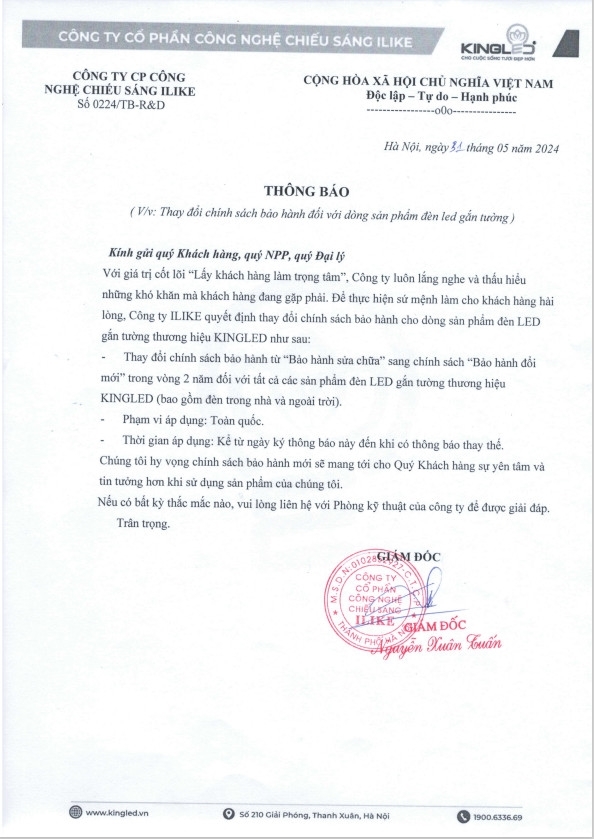Lấy khách hàng làm trọng tâm, ILIKE luôn lắng nghe và thấu hiểu mọi nhu cầu, mong muốn của Quý khách hàng. Chính vì vậy, để mang đến trải nghiệm mua sắm và sử dụng sản phẩm hoàn hảo hơn, ILIKE hân hạnh thông báo thay đổi chính sách bảo hành đối với dòng sản phẩm Đèn LED Gắn Tường Kingled như sau: